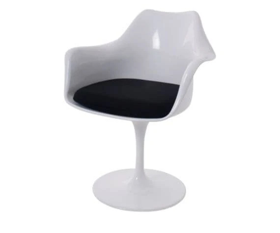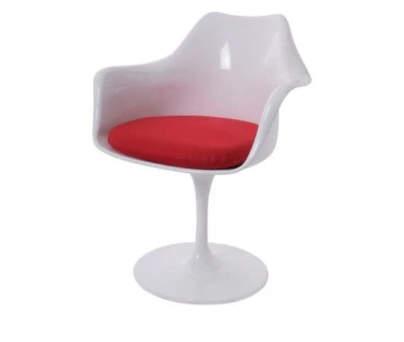 Eero Saarinen's idea was to remove the chair legs, making the chair elegantly streamlined. It is supported by a single stem connected to a curved swivelling aluminium base. Our sophisticated, practical, and high quality reproductions of the Tulip Chairs fit into any environment and look particularly good as a set around any dining table, adjacent to a vanity unit as a makeup chair, or as an occasion chair.